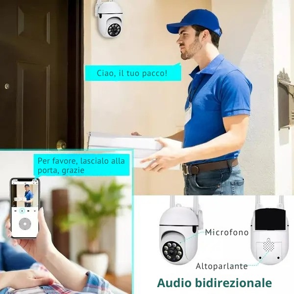 L’utile microfono incorporato sulla telecamera di sicurezza per esterni vi permette di parlare attraverso la nostra app. L’audio bidirezionale vi permette di comunicare con le persone e l’allarme di movimento vi permette di sbarazzarvi di persone non desiderate o animali.